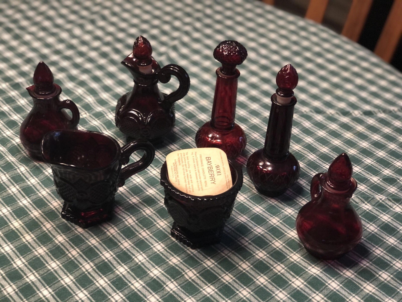 AVON 7 PIECE LOT 1 SUGAR BOWL WITH CANDLE 1 CREAMER I CRUET 2 BUBBLE BATH WITH STOPPERS 2 6 &1/2 RED BOTTLES WITH STOPPERS STOPPERS DON'T MATCH THESE LAST 2 ARE AVON RED GLASS NOT RUBY THESE ARE ALL VERY NICE I SOLD AVON YEARS AGO AND HAD THESE LEFT OVER QUESTIONS WELCOME THANKS FOR VISITING MY E-BAY STORE "WHITE CAT EMPORIUM"