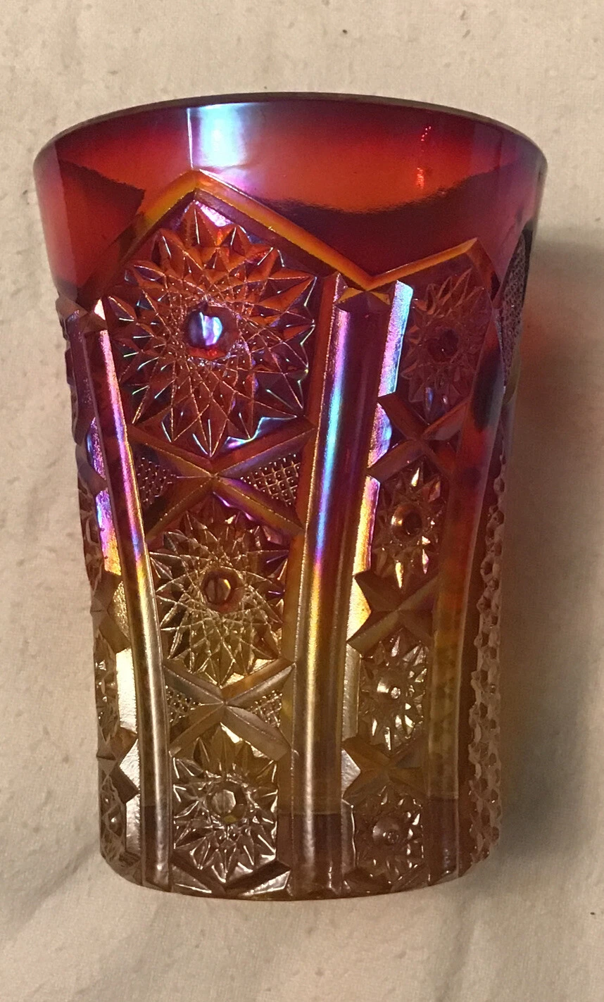 Fenton? Water Tumbler Shaded Amber To Cranberry Pressed Glass Arches Flowers. Please check pictures & ask questions, measures about 4 1/4” tall, top is 3 1/8” & bottom is 2 1/4” Condition is "Used". Shipped with USPS Priority Mail.