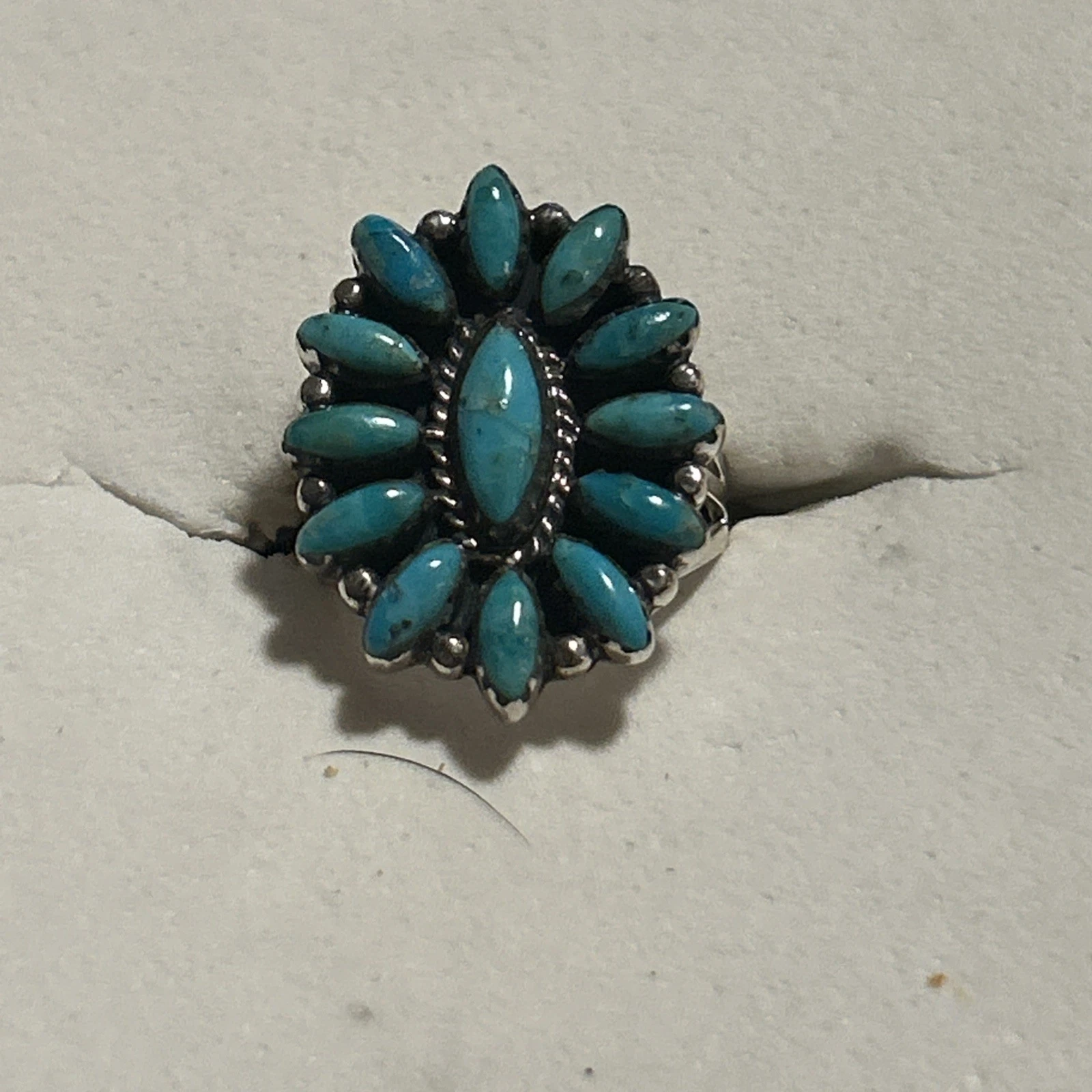 This Vintage Native American Zuni Sterling Silver Petit Turquoise Stones Ring in size 6 features beautiful blue turquoise stones set in sterling silver. The Zuni tribal affiliation adds a unique cultural touch to this vintage piece, making it a stunning addition to any woman's jewelry collection. The intricate details and traditional design make it a standout piece for those who appreciate ethnic and regional jewelry styles.