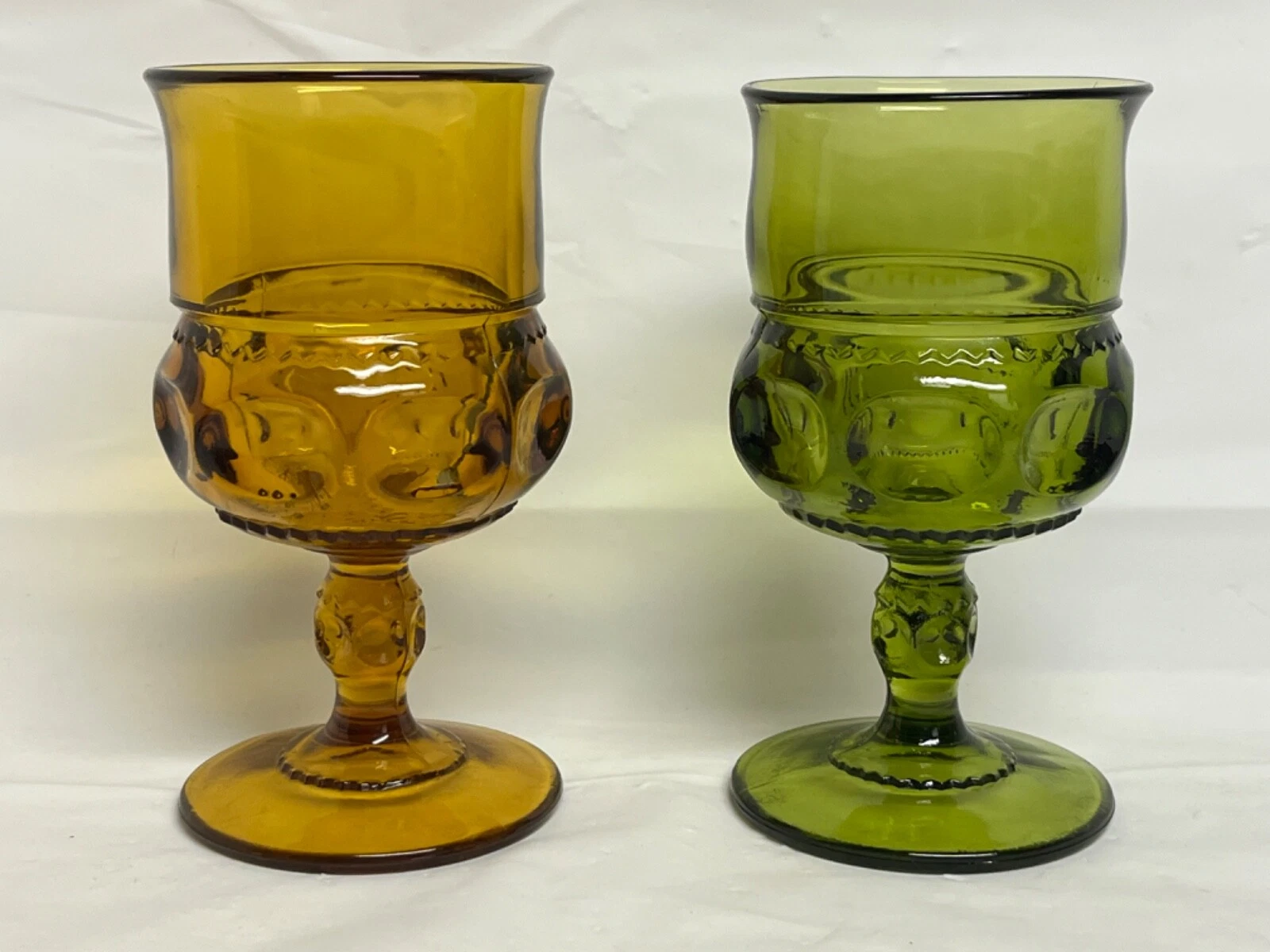 2 Vintage Indiana Kings Crown Amber Glass Thumbprint Cocktail Goblet 5 3/4" tall, one green & one gold, both in excellent condition.