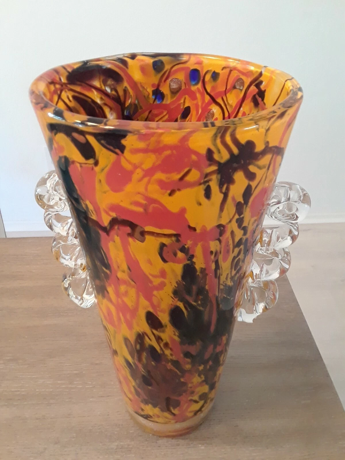 ALEXANDER KALIFANO ART GLASS HAND BLOWN COLORFUL VASE GLASS RIBBON HANDLES. This gorgeous decorative vase is One of a Kind art. These pictures don't show the true beauty of this vase. Excellent pre owned condition. There are no chips or damage of any kind on this piece. This was found at an estate sale with many vases. The swirls of colors are amazing. Orange, reds, blacks with gold sparkles and small touches of blue accents. Lovely clear glass ribbon handles on each side with a clear base at the very bottom. The original label is on the bottom. This measures 13.5" tall and the opening is 6" across. Shipping FedEx ground.