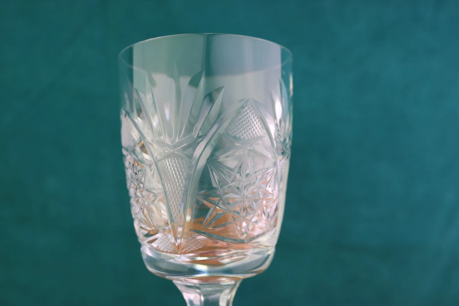 Clear with arches, cross hatch, star and fan pattern on bowl. Stem has a central knob.