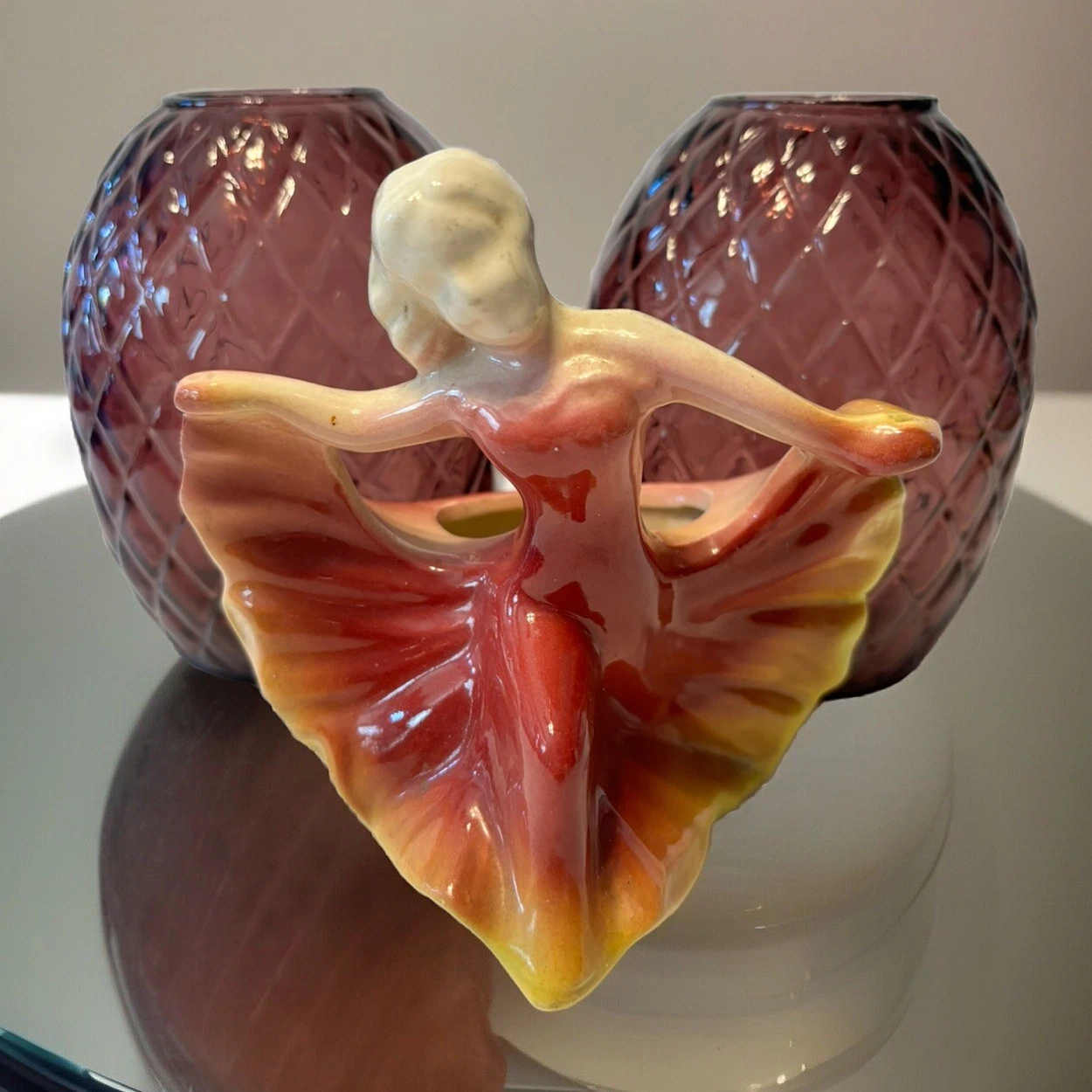 Set of 3: Vintage 2 Amethyst Diamond Cut Art Glass Flat Back Wall Vases And 1 Art Deco Dancing Lady Vase All in excellent pre-owned condition. Please view all photos.